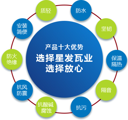 公司主要產(chǎn)品有《星發(fā)牌》合成樹脂瓦、APVC防腐耐候復(fù)合瓦、APVC發(fā)泡隔熱瓦、PVC半透明瓦、PVC防腐隔熱瓦、PVC防腐瓦、PVC防腐平板、PVC條紋板和ASA/PVC超耐候復(fù)合瓦等產(chǎn)品。產(chǎn)品一經(jīng)推出,已被廣泛應(yīng)用于國內(nèi)各類平改坡項目和大型工業(yè)項目,遠(yuǎn)銷歐洲、亞洲、美洲和非洲等國外市場,還獲選為廣州亞運(yùn)會、深圳大運(yùn)會、四川災(zāi)后重建等工程項目的應(yīng)用產(chǎn)品。公司在不斷創(chuàng)新和改革的基礎(chǔ)上,力求以更好的產(chǎn)品、優(yōu)良的服務(wù),用心、專心服務(wù)好每一個客戶。